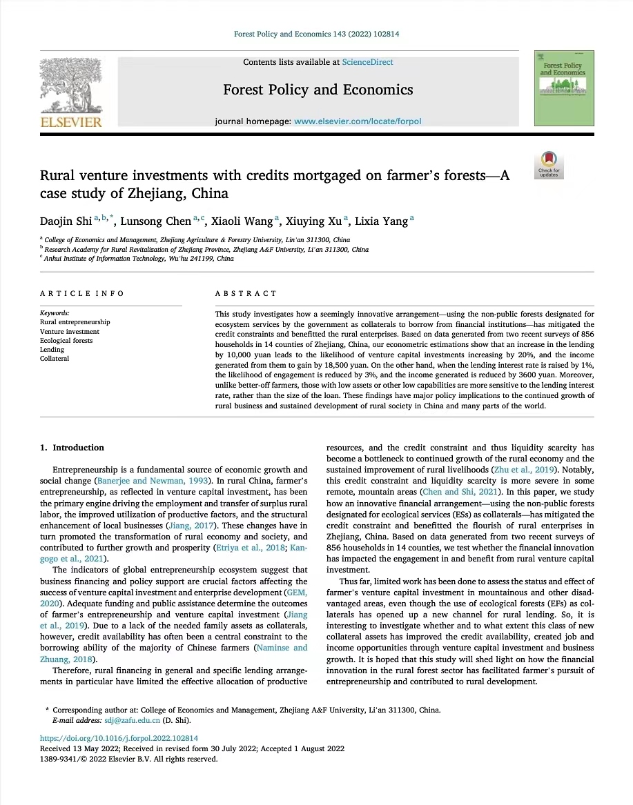 石道金教授研究成果在权威期刊《Forest Policy and Economics》发表 近日,我院院长石道金教授撰写的论文《Rural venture investments with credits mortgaged on farmer’s forests -- A case study of Zhejiang, China》在《Forest Policy and Economics》(SSCI一区,SCI中科院(升级版)二区Top)发表。 该研究基于浙江省森林生态公益林补偿政策的改革实践,对浙江省14个县(市)林业、财政和金融管理部门以及856个山区农户进行了实地访谈和问卷调查,运用Logistic模型、Tobit模型、IV-...