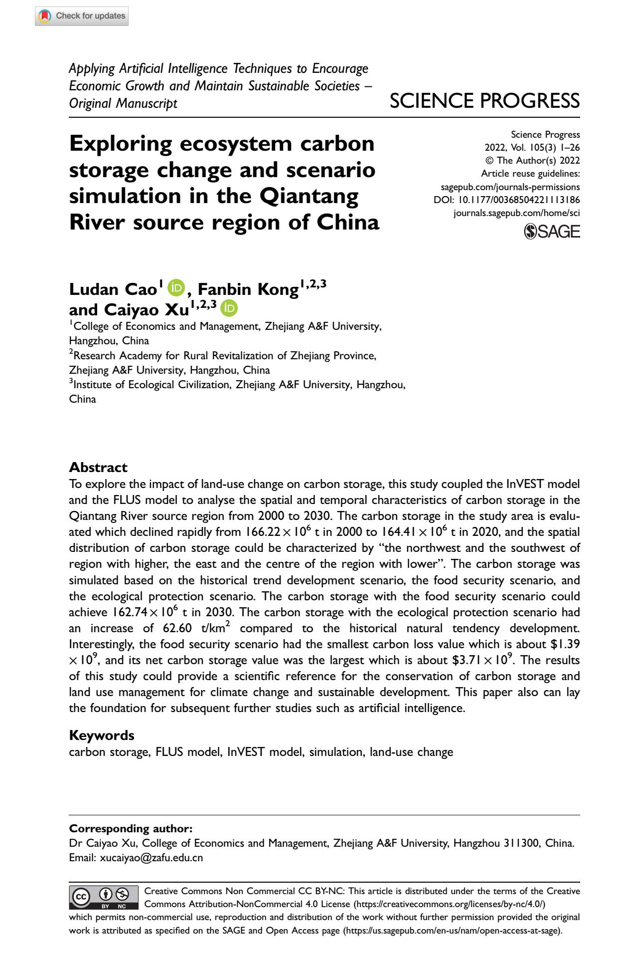 孔凡斌教授团队成果在SCI期刊《Science Progress》在线发表 近日,我院孔凡斌教授团队的研究成果《Exploring ecosystem carbon storage change and scenario simulation in the Qiantang River source region of China》在SCI检索期刊《Science Progress》在线发表。我徐彩瑶博士为论文通讯作者,孔凡斌教授为论文合作作者。 该论文是孔凡斌教授主持的浙江省自然科学基金重点项目“钱江源‘山水工程’生态系统固碳服务供需权衡机制及碳中和规划管理优化”(Z22D010686)等项目的阶段...