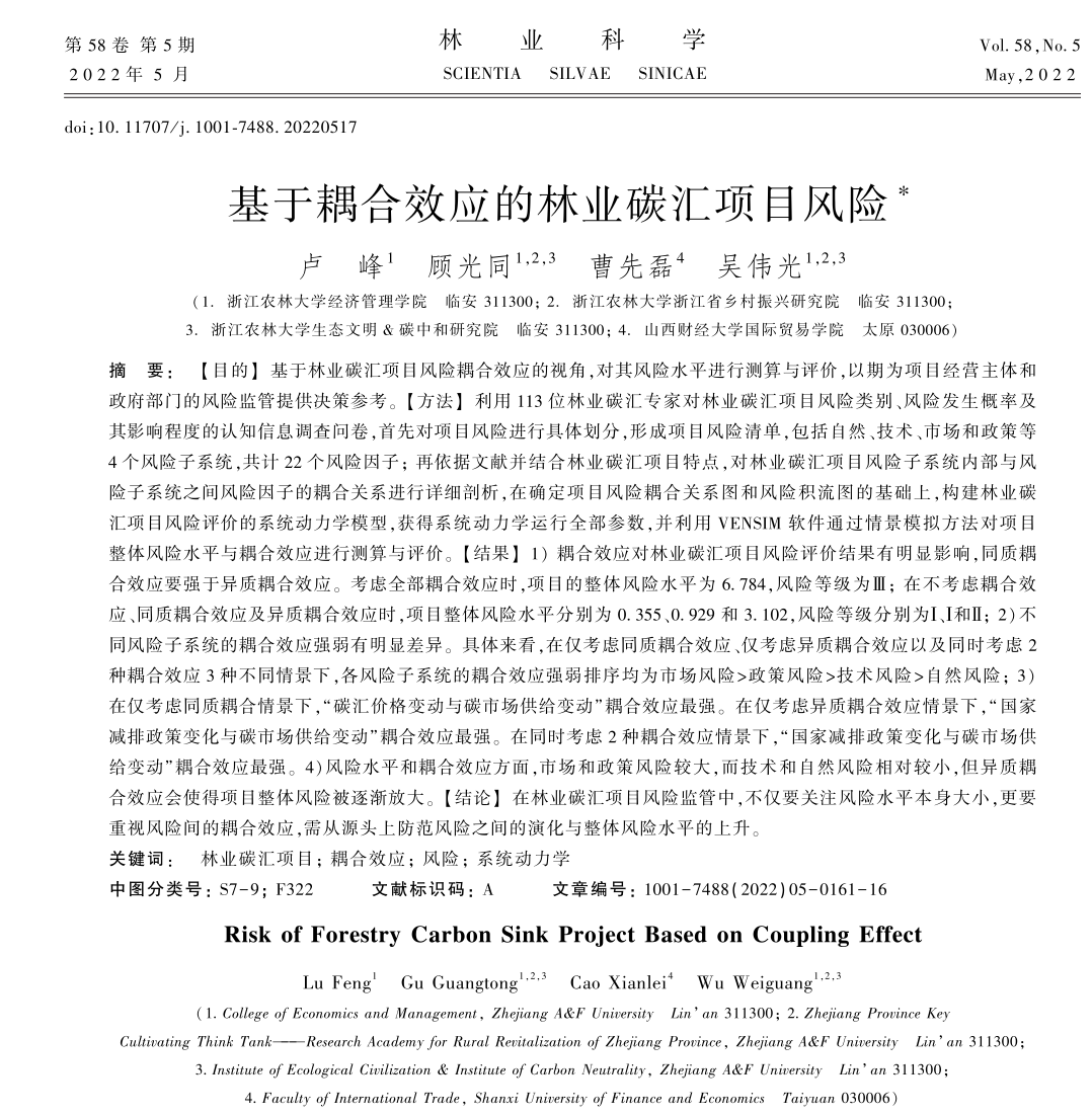 吴伟光教授团队研究成果在《林业科学》发表 近日,我院吴伟光教授和顾光同副教授与其共同指导的农林经济管理硕士研究生卢峰等合作的研究成果《基于耦合效应的林业碳汇项目风险》在《林业科学》2022年第5期发表,吴伟光教授为该文通讯作者。《林业科学》是浙大一级期刊,也是EI检索源刊。 森林碳汇是应对气候变化潜力较大且较为经济有效的手段之一,我国已将森林增汇作为应对气候变化的国家战略,并于2020年正式提出了“碳达峰碳中和”宏伟战略目标。在此背景下,林业...