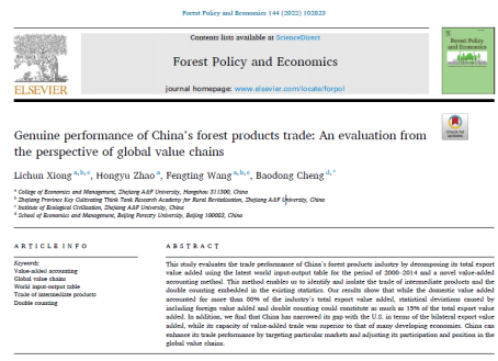 熊立春副教授论文在《Forest Policy and Economics》发表 近日,由我院熊立春副教授撰写的论文《Genuine performance of China’s forest products trade: An evaluation from the perspective of global value chains》在《Forest Policy and Economics》发表。熊立春副教授为论文第一作者,北京林业大学国家林草经贸研究院院长程宝栋教授为论文通讯作者,该期刊属于SSCI一区。 该文以木材产业为研究对象,基于2016版世界投入产出表数据,评估了2000-2014年中国木材贸易真实绩效...