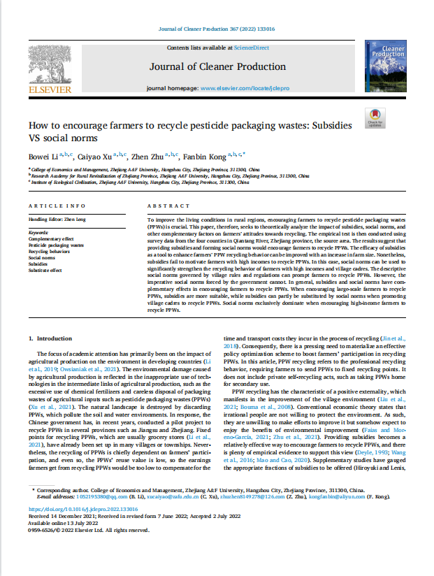 孔凡斌教授团队成果在SCI Top期刊发表 近日,我院孔凡斌教授、副院长朱臻教授,以及李博伟副教授和徐彩瑶博士共同撰写的论文《How to encourage farmers to recycle pesticide packaging wastes: Subsidies VS social norms》在SCI Top期刊《Journal of Cleaner Production》发表。 该文讨论了补贴和社会规范在激励农户回收农药瓶时的替代和互补效应。研究结果表明,提供补贴和形成社会规范将鼓励农民回收农药瓶。补贴作为政策工具的有效性随着农场规模的增加而...