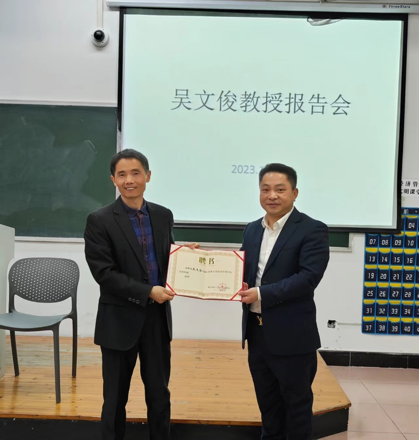 11月30日下午,琦星智能科技有限公司副董事长吴文俊先生受聘为bv伟德国际1946兼职教授暨报告会在教学主楼201教室举行。bv伟德国际1946企业管理学科负责人张国庆教授为吴文俊教授颁发聘任证书。