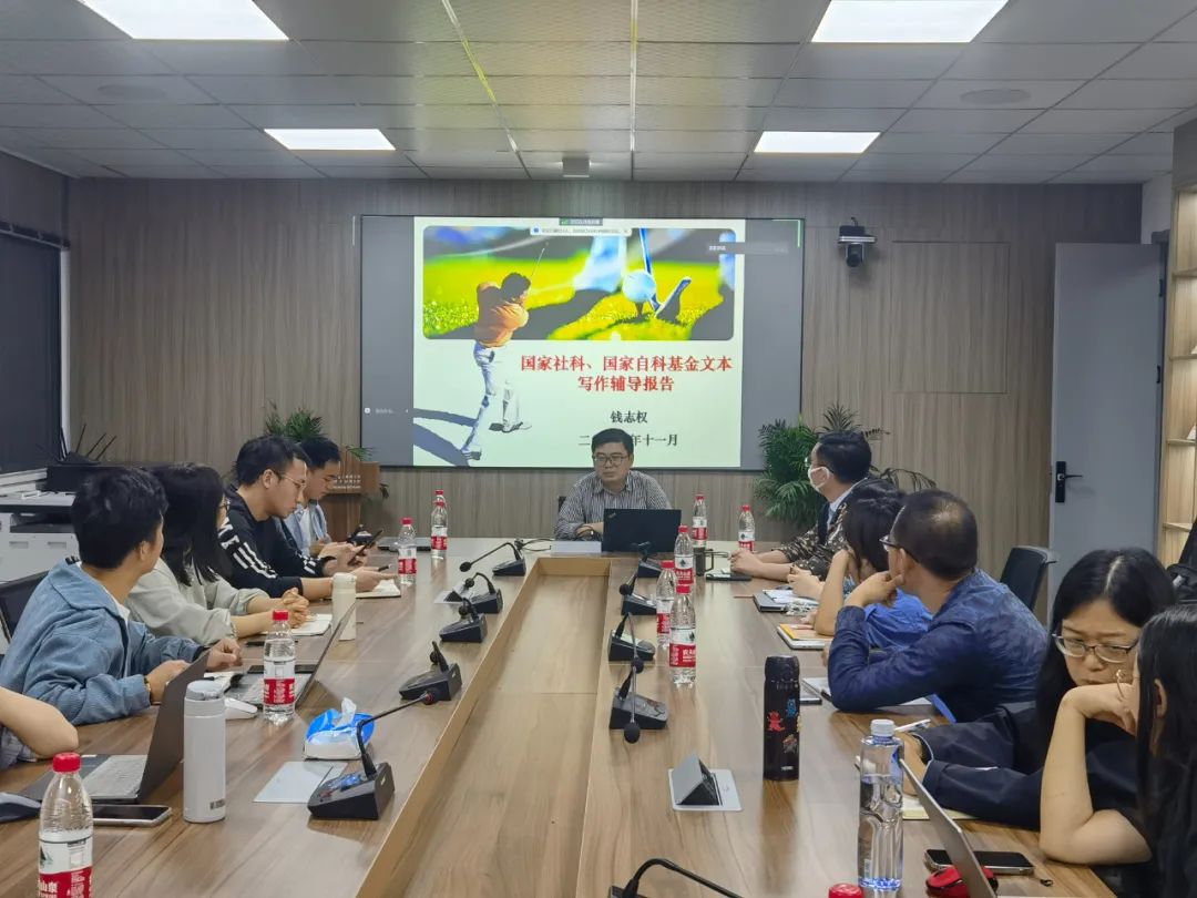 钱志权副教授从选题立意、社科基金撰写技巧、自科基金撰写要点、文本打磨四个方面进行指导,并且谈到了自己的几点体会。他指出,选题立意要符合国家大政方针,立足学校办学优势,延续过去研究基础,定选题画龙点睛,相机而定加题解,注意区分国家社科与国家自科基金的区别。
